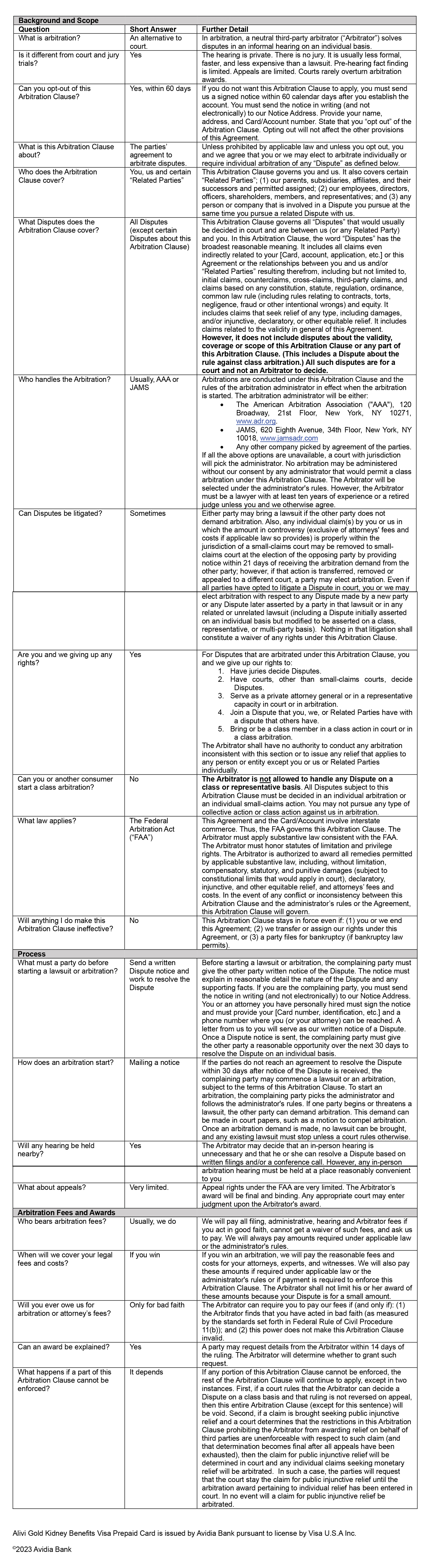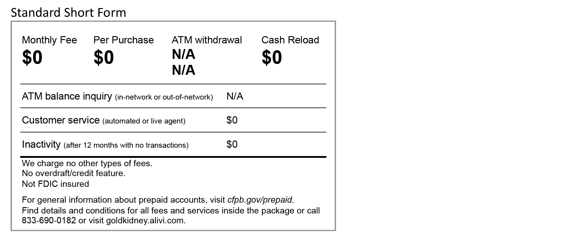 Alivi Gold Kidney Visa® Prepaid Card is issued by Avidia Bank, pursuant to a license from Visa U.S.A Inc. Card is serviced by Fidelity Information Services, LLC (FIS).