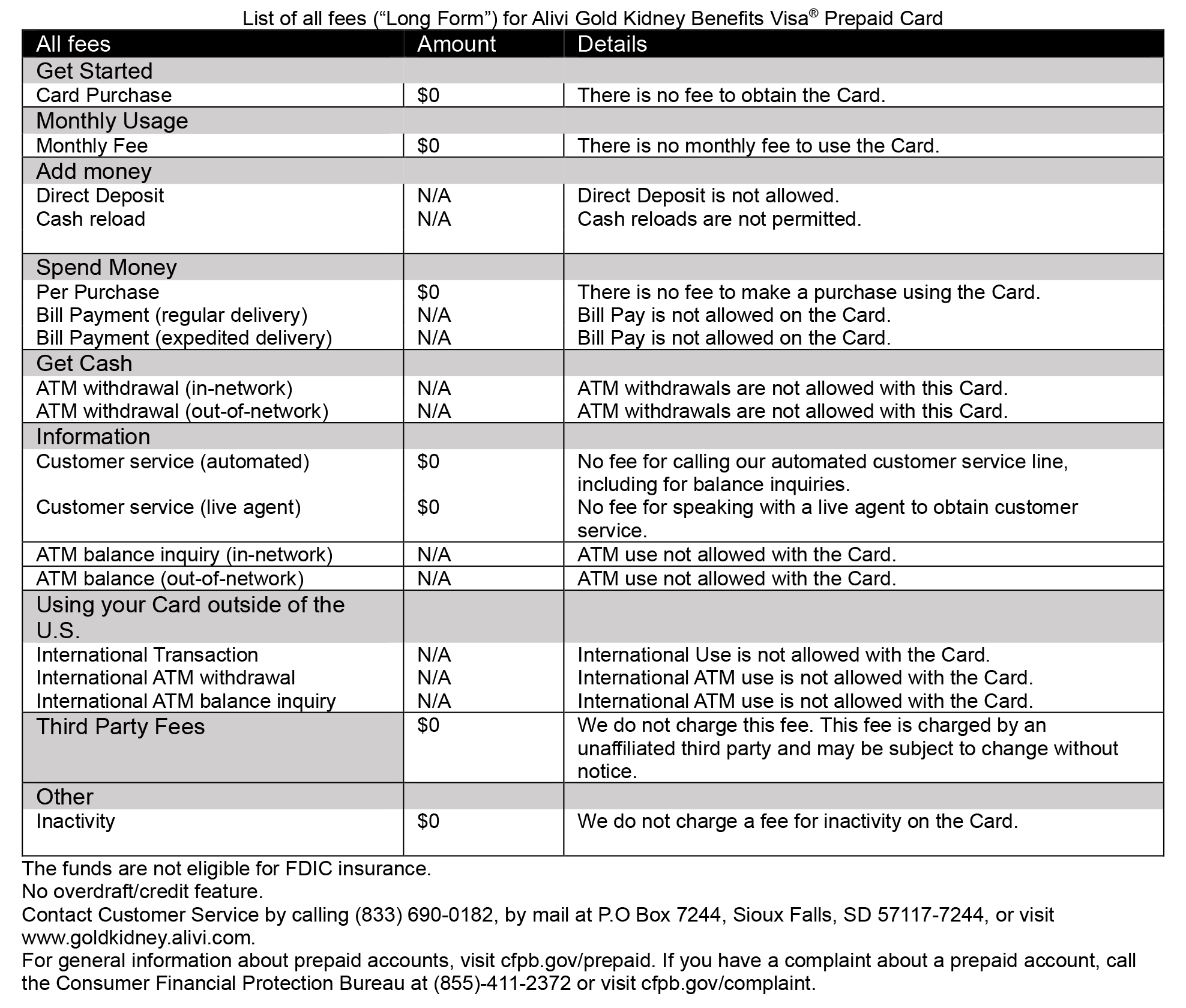 Alivi Gold Kidney Benefits Visa® Prepaid Card Cardholder Agreement