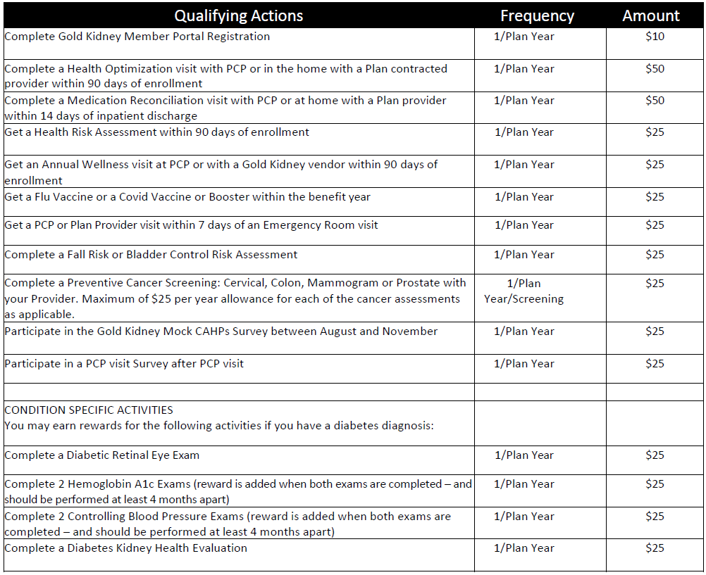 4. Qualifying Actions. Rewards are earned by completing a predetermined qualifying action defined and outlined by the Health Plan,listed below. You must complete and submit a Wellness Activity Form accessible from GoldKidney.com/rewards-incentives/ indicatingthe Reward activity completion information, along with the provider’s name and address to Gold Kidney to Gold Kidney Health Plan.